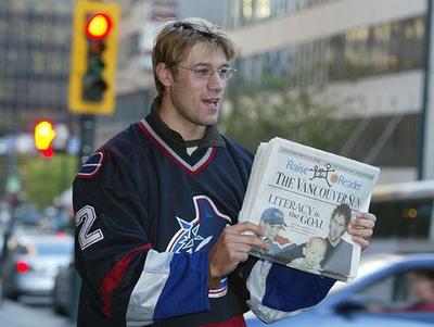 This is what I don't understand: why do some guys get it all? Like Mattias Ohlund, for instance. Here is a nice fellow from Sweden, one of the best young defenceman in hockey, a multi-million-dollar salary, a body like Jean-Claude van Damme, a dishy new car, a gorgeous girlfriend. Most guys I know would be happy with any one of those, let alone them all. But it's worse. Ohlund has blonde hair, blue eyes and the ruggedly handsome features that, well, women find irresistible. - Gary Mason, The Vancouver Sun.