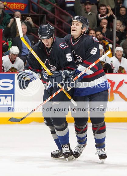 "Not even a kiss from Marek Malik could persuade fellow defenceman Mattias Ohlund to relinquish just one Canuck sticker." - haha so cute